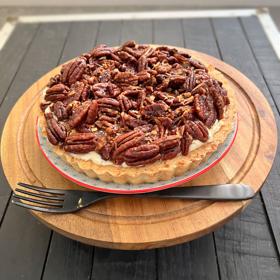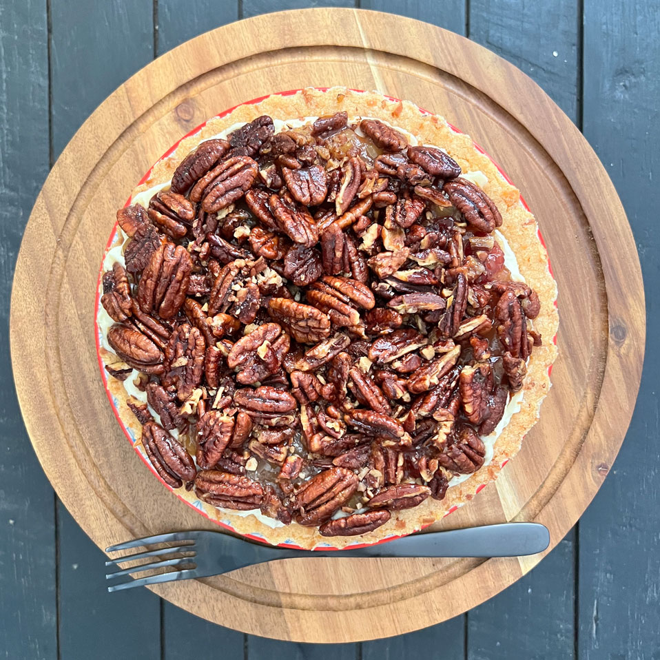 A crisp golden tart piled with perfectly spiced apple chunks, tart cherries and cranberries lounging over a luscious layer of Apreval Calvados Brandy spiked mascarpone. Topped with glazed pecans and pure swagger, it’s rich, warming, and will hit the spot.